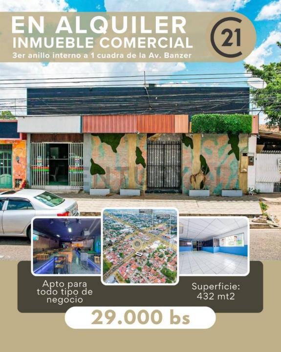 LOCAL COMERCIAL EN ALQUILER SOBRE AV NOEL KEMPFF MERCADO 3ER ANILLO INTERNO A PASOS DE LA AV BANZER, tiene 432 m2, que se pueden adaptar para todo tipo de rubros: billares, karaoques, Resto Bar, Showrroms, Exposición de Marcas, Oficinas corporativas, Centros de atención al cliente, Tiendas comerciales y más. PAMELA RODRIGUEZ (ref:94053)