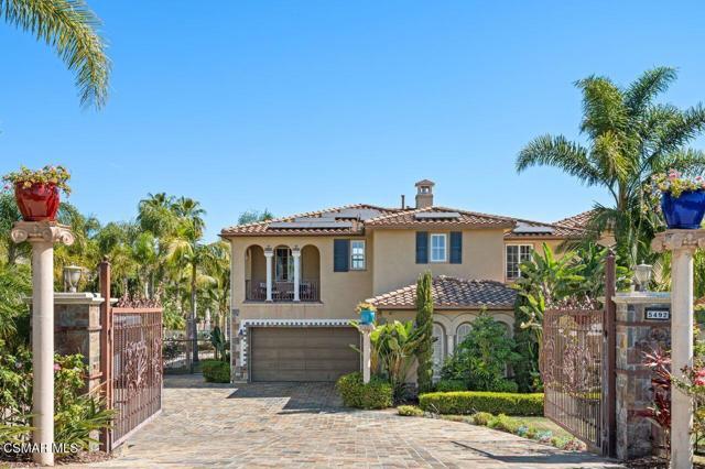 Resort-Style Mediterranean Ranch Living in the Heart of Camarillo. Experience the ease of California luxury in this beautifully appointed Mediterranean estate, where timeless architecture and relaxed indoor-outdoor living come together in a private, resort-inspired setting. From the moment you arrive, the home's clay tile rooflines, and graceful arched entry set a tone of understated elegance and warmth. Step inside to a dramatic two-story foyer, where a sweeping curved staircase with wrought-iron detailing frames the space, and intricate travertine medallion flooring makes an unforgettable first impression. Natural light pours through the home, highlighting soaring ceilings, refined finishes, and a seamless flow between formal and casual living areas designed for both entertaining and everyday comfort. At the heart of the home, the chef's kitchen blends functionality with style and features rich wood cabinetry, granite countertops, stainless steel appliances, and a generous center island perfect for gathering. Multiple living spaces offer flexibility and comfort, while a dedicated home theater/media room with custom built-ins creates the ultimate setting for movie nights and relaxed evenings in. Outdoors, the property truly shines as a private retreat. A resort-style, free-formed pool is surrounded by terracotta paver decking, evoking a boutique hotel ambiance. The covered patio, framed by decorative brick, invites al fresco dining and year-round enjoyment, all set against a backdrop of mature tropical landscaping, including stately king and fan palms and meticulously manicured grounds. Private Guest House Retreat: Adding exceptional versatility, the detached guest house mirrors the main residence in both architectural charm and quality. Featuring one bedroom, one bath, in-unit laundry, and its own private patio, this self-contained space offers comfort and independence for extended family, guests, or potential rental income. With its cohesive Mediterranean styling--cream stucco exterior, clay tile accents, dark shutters, and terracotta paver details--it feels like a natural extension of the estate while maintaining its own sense of privacy. A rare offering that blends elegance, comfort, and flexibility, this Camarillo property captures the essence of refined Southern California living.