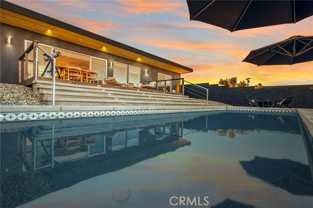 Welcome to your own private Shangrila. This stunning property is over 2 acres with a fenced saltwater pool, spa, outdoor shower, and infrared sauna. As a newer construction, you will enjoy the best modern and stylish living with quality finishes, fixtures, and decor on show around every turn. The residence consists of a primary residence with 1,412 sqft, plus a separate 488 sqft casita and converted 480 sqft garage you are ready to accommodate visitors and guests who come to share in this serene lifestyle. From the moment you step inside the primary residence, you will feel bright and inviting, and the open-concept design will encourage you to kick back and relax. A clean-burning, pellet stove fireplace in the living and dining area ensures a warm ambiance on cool winter nights. While the kitchen is beautifully finished and ready for you to cook up a storm. Here, the eager chef is treated to a suite of quality appliances, sweeping countertops, and a large center island with breakfast bar seating. Depending on the mood and occasion, you can prepare a gourmet feast, dine indoors, or step out to the observation deck and host friends under the stars. Picture-perfect views over the landscape will provide the ideal backdrop to this stunning abode, whether you’re sipping a refreshing afternoon drink floating in the pool or admiring the glorious vistas of the surrounding boulders and mountains beyond. There are two master bedrooms dressed to the nines, both offering a walk-in closet and a master bath and a split-bedroom design promising peace and privacy. Completing the floor plan is a mechanical room, a compact laundry, and a detached two-car garage with electricity, mini-split heating and cooling, and windows for secure vehicle parking; it is currently a creative workspace. The separate casita has a studio-style bedroom, mini-kitchen, walk-in closet, and bathroom, ensuring added functionality for guests. This unique and sought-after property is located just minutes from the Joshua Tree National Park, with hiking trails at your fingertips for those who like to immerse themselves in nature. There is even a rock labyrinth for meditation on the property. Easy access to schools, shopping, and major roads promises convenience, while the bustling heart of Joshua Tree is also nearby with everything you could ever need. Property owners recently, obtained a Short Term Rental Permit that can be used while new owner applies for a permit, buyer to verify with County.