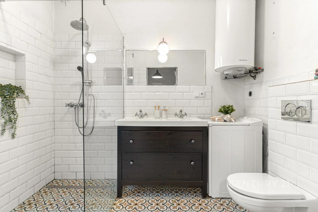 Po vstupu do domu projdete předsíní a chodbou do prostorného obývacího pokoje s kuchyňským koutem. Odtud můžete dále pokračovat do dalšího pokoje a spodní koupelny nebo vyjít na zahradu. Po schodech se dostanete do druhého podlaží, ve kterém se nachází ložnice, druhá koupelna a terasa. Součástí domu je sklep a další terasa orientovaná do zahrady, která poskytuje příjemné soukromí.