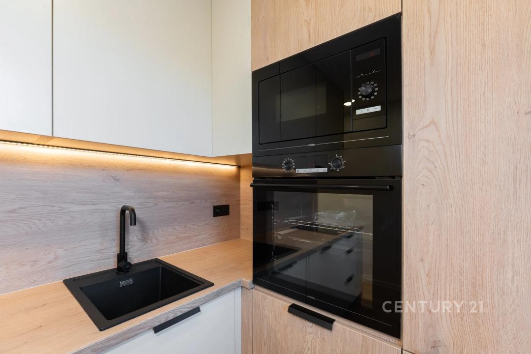 t•tModerní kuchyňská linka (LED podsvícení) s vestavnými spotřebiči (lednice, myčka, elektrická trouba, sklokeramická deska, mikrovlnná trouba a digestoř) t