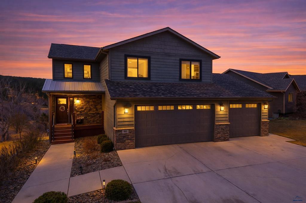 Welcome to this beautiful two-story home in the desirable Ridge at Catron Crossing subdivision, offering 4 bedrooms, 3.5 bathrooms, and over 3,500 finished square feet of well-designed living space. Built in 2014 and situated on a 0.26-acre lot, this home features an open main level with tall ceilings, a spacious living room centered around a cozy gas fireplace, and a functional kitchen complete with breakfast bar, walk-in pantry, and adjoining dining area with access to the deck, which is perfect for indoor-outdoor living. The upper level includes three bedrooms, each with a walk-in closet, a full bathroom, a loft, and convenient upper-level laundry, while the primary suite offers a relaxing retreat with double sinks, a tiled shower, and a soaking tub. The walkout basement is finished with a large family room, an additional bedroom with a walk-in closet, a 3/4 bathroom, and extra storage space, with potential for future laundry. Additional highlights include central air, forced-air heat, a three-car attached heated garage, a sprinkler system, and beautiful hill and neighborhood views from all levels. Located in Rapid City with easy access to amenities, this home offers space, functionality, and comfort in a sought-after neighborhood.