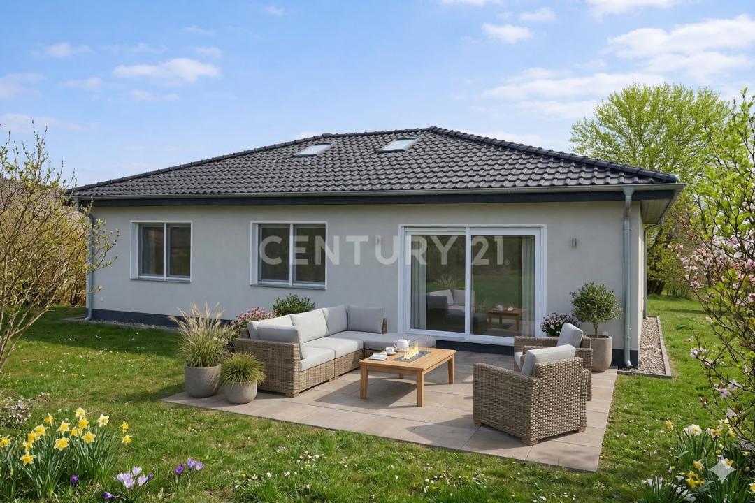 Dieser elegante Neubau-Bungalow in Massivbauweise bietet Ihnen ca. 118 m² Wohnfläche auf einem ca. 1.216 m² großen Grundstück – mit freiem Blick ins Feld. Ein durchdachtes Raumkonzept, hochwertige Ausstattung und die bezugsfertige Ausführung machen dieses Haus zu einem Zuhause zum Wohlfühlen.