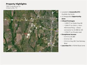 Discover this exceptional vacant land parcel located at TBD Industrial Dr, Greenville, TX, offering unparalleled potential for commercial and industrial development. Spanning a strategic location with excellent road frontage and connectivity, this property boasts seamless access to major thoroughfares, ensuring efficient transportation and logistics operations. Its proximity to the Dallas-Fort Worth Metroplex positions it ideally for businesses seeking to capitalize on regional growth and connectivity. Key property highlights include a dedicated water line advantage, enhancing utility readiness for immediate development. The site features favorable topography with minimal FEMA floodplain concerns, providing a solid foundation for construction. Surrounded by complementary nearby land uses, this parcel is situated within the city's Extraterritorial Jurisdiction (ETJ) and qualifies as an Opportunity Zone, offering attractive incentives for investors and developers. This versatile land is perfectly suited for a variety of high-demand uses, including warehouse facilities, logistics hubs, manufacturing plants, or state-of-the-art data centers. With great access and robust infrastructure support, it presents a rare chance to build in a thriving industrial corridor. Don't miss this opportunity to shape the future of Greenville's economic landscape—contact us today for more details!
