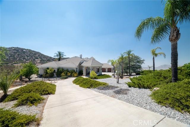 Privacy is paramount on this stunning 4+ acre property, perched on a hillside in the desirable gated community of The Ranch at Sky Mesa. The pull-thru driveway leads to a unique portico, and the entire property has been beautifully landscaped to stay low-maintenance & drought-tolerant. Inside the stately oak front door, you'll find an open formal dining/living room with hardwood floors, high ceilings, crown molding, a cozy fireplace and a marble wet bar for entertaining. The home features massive windows that showcase the stunning citylight & sunrise/sunset views from nearly every room. At the rear of the floorplan, the timeless kitchen offers cherry cabinetry, quartz countertops, top-of-the-line stainless appliances, a center island, a dining nook and a breakfast bar that overlooks the huge family room with another fireplace. The family room also opens up to the expansive covered patio, which has plenty of space to entertain or enjoy a morning cup of coffee & mountain views. Back inside, the main floor primary bedroom boasts a sitting area and a spa-like ensuite with a long double vanity, a corner soaking tub and frameless glass shower. Both guest bedrooms upstairs enjoy access to the massive rear balcony, with unobstructed views of the rolling hills. The exterior spaces & the spectacular views really make this property shine! There are walking paths, a firepit area, water features and a lighted concrete pad that could be a basketball/ pickleball court, RV parking or a foundation for a future pool house or ADU. The property also includes numerous fruit trees (lemon, orange,peach, plum) and an irrigation system for easy maintenance. Don't forget about all the storage in the 3-car garage, and the solar roof panels that keep utility costs low. The Ranch at Sky Mesa may feel like an isolated community, but you'll be just minutes from downtown Homeland – with lots of shopping & dining options in both directions along the 210 Fwy and Hwy 79. This quiet Riverside County location also puts you close to businesses & attractions in San Bernardino, San Diego, Orange & Los Angeles Counties. Come take a tour!