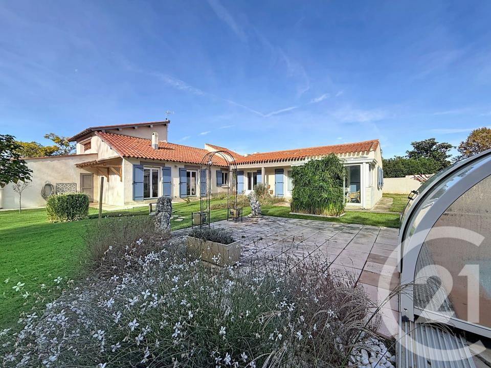 Les extérieurs ont été soigneusement aménagés : piscine maçonnée, cuisine d'été, allées et massifs paysagers. Un garage attenant de 15 m² complète la maison, accompagné d'un second garage de près de 50 m², idéal pour plusieurs véhicules et un atelier. La propriété dispose également d'un portail automatique et de volets battants traditionnels (PVC ou aluminium à confirmer).