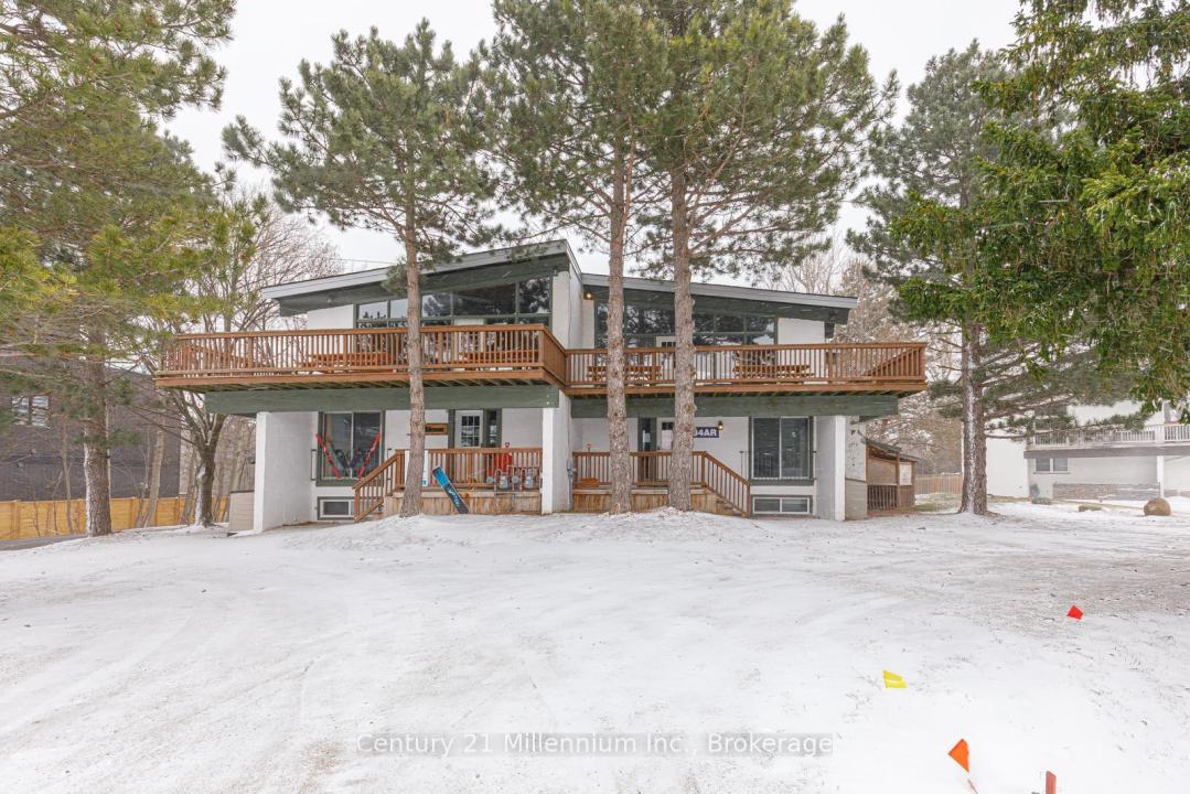 SHORT-TERM RENTAL PROPERTY (STA) WITH A SAUNA AND HOT TUB! Invest and play in this 6-bedroom 2 Bathroom chalet licensed for 16 people. Revel in the chance to own a captivating chalet ideally situated within a short stroll from the base of Blue Mountains. Immerse yourself in the charm of six bedrooms, two bathrooms, and a wealth of space designed for both guests/family/ friends to gather comfortably. The allure of this chalet extends beyond its walls, featuring a hot tub, sauna, and a picturesque wrap-around deck. This chalet has an open-concept living-dining-kitchen area where guests/friends/family can eat, and relax together while enjoying the warmth of the gas fireplace. Experience the essence of a quintessential chalet vibe, with Scandinavian-inspired design elements and breathtaking views of Blue Mountains from the upper level. Picture yourself sipping hot cocoa after a day of skiing, witnessing the ski hill transform into a sparkling wonderland during night skiing. Only a short drive to Northwinds Beach, walk to Monterra Golf Course, Tennis club and the Village. This property promises a year-round escape for all seasons. Situated on a generously sized fully serviced lot, this gem also presents an enticing prospect for investors eyeing future development opportunities. New Refrigerator (2024)-/Stove(2026) New Roof (2023) New Hot tub/BBQ (2025). HST is in addition to, which can be deferred if the buyer is an HST registrant. NO BMVA FEES!
