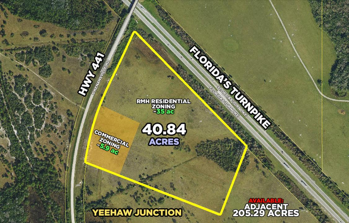 This expansive 40.84-acre property in Okeechobee is located at the Florida Turnpike/State Road 60 exit at Yeehaw Junction - only 30 minutes from Vero Beach and central to all major Florida markets. Currently zoned RMH residential with almost 6 acres of the property approved for commercial future land use. In addition to potential residential development, this property is in a prime location for various industrial and commercial uses such as distribution centers or mixed use. Features 1700 feet of frontage on the Turnpike with an income-generating billboard and 1700 feet of frontage on US 441/Kenansville Rd. Owned by the same family for over 50 years. The adjacent 205+ acre property is also available for purchase for a potential of 246+ acres combined.