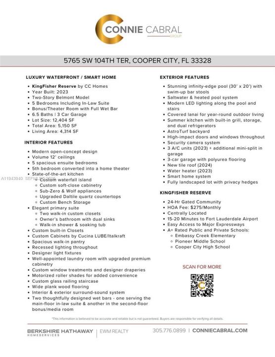Welcome to Kingfisher, Cooper City’s newest exclusive gated waterfront community. This brand-new Smart modern residence sits on a prime 12,400 sq ft lakefront lot and offering a total of 5,150 square feet of refined living space. The Belmont model features 5 bedrooms with option for a sixth bedroom, 6.5 bathrooms, soaring 12-foot ceilings, expansive open-concept living areas, sleek recessed lighting, and custom-built closets throughout. Kitchen is equipped with Wolf and Sub-Zero appliances, custom cabinetry, and an oversized island ideal for entertaining. Additional highlights include a private home theater that may serve as a 5th bedroom with private bathroom , hurricane impact windows and doors, and a 3-car garage. Step outside to a fully enclosed private outdoor oasis with a heated saltwater infinity-edge pool, summer kitchen, lake views, and a full cabana bath—perfect for seamless indoor-outdoor living. Flawlessly finished with exceptional attention to detail. Ideally located near Broward County’s top-rated public schools and minutes from American Heritage School and Nova Southeastern University. Price is firm!