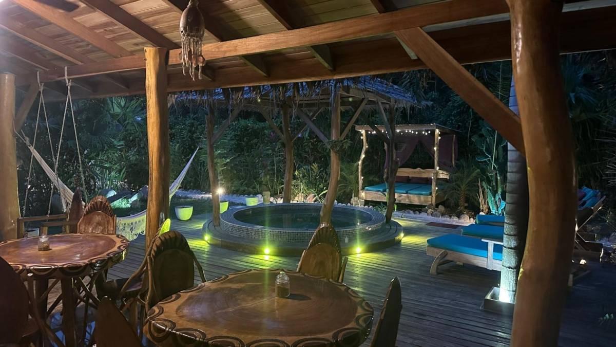 El jardín es un verdadero oasis tropical, rodeado de **plantas exóticas, flores y árboles** que atraen fauna local como **perezosos, monos, tucanes, mariposas y mucho mas**. En el área exterior se encuentra un **jacuzzi adicional**, junto a un espacio acogedor para relajarse, compartir, leer o disfrutar del clima caribeno.