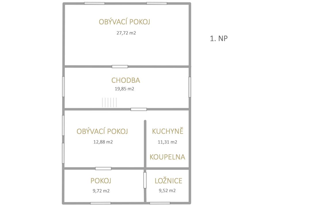 1. podlaží: Hlavní obytná část, kuchyně, koupelna a zázemí