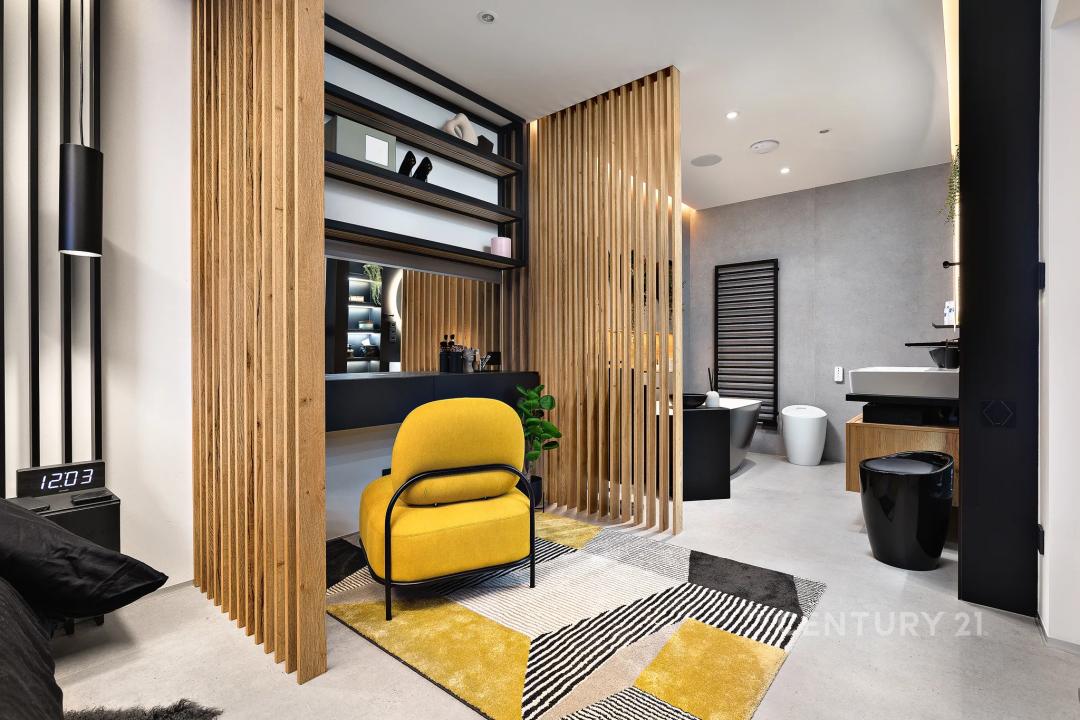 Ložnice je řešena v luxusním hotelovém stylu s efektním podsvícením, decentními barevnými akcenty a důrazem na klidovou atmosféru. Koupelna zaujme moderním designem v kombinaci betonu, dřeva a černých prvků. K dispozici je volně stojící vana, prostorné umyvadlo s podsvíceným kruhovým zrcadlem a kvalitní sanita.