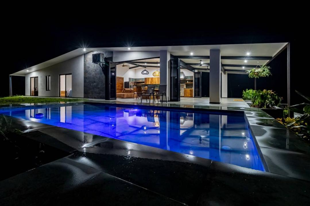 Main Residence: Modern 4-Bedroom/2-Bathroom + Office solar-powered villa. Features a foldable glass wall that merges a massive chef’s kitchen with a poolside lounge.