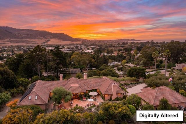 Welcome to a sun-kissed retreat in Rancho Rio Vista, where Mediterranean charm meets resort-style living. This warm and inviting estate offers over 3,400 sq.ft. of character and comfort in the 3 bedroom/3 bath main house, and a charming studio apartment above the garage ideal for guests or creative use on over an acre of land. Classic tile floors, graceful archways, skylights and soaring ceilings flow throughout the home creating a light and airy environment. The living room features a gas log fireplace, open-beam ceilings, French doors and sunroom with sweeping mountain views to the south. The kitchen is designed for gourmet cooking, complete with island, breakfast bar and nook, double ovens, plenty of storage and wine fridge, while the formal dining room offers an elegant and intimate entertaining space. The ground-floor primary bedroom suite is a peaceful haven with hillside views, spa-like bath and a secluded deck with private hot tub access. Outside features include a water feature, lush gardens blooming with roses, fig and fruit trees, rosemary and lavender, hillside olive orchard, and large south-facing deck with barbecue area and space to relax or dine al fresco. With a 3-car garage, owned solar, air conditioning and generator, this is Carmel living at its finest.