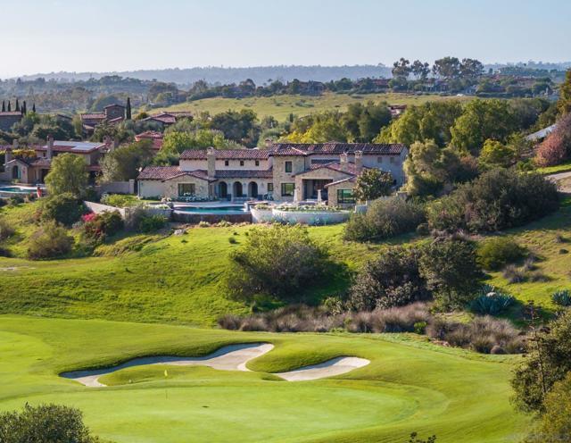 Resting behind the gates and above the 13th green of the award winning Santaluz golf course, this home blends timeless design with effortless California living. Vaulted and groin ceilings, arched passages, hand-finished stone, and rich wood beams create interiors that feel both elevated and inviting, while walls of glass frame uninterrupted fairway views. The elegant kitchen—anchored by Taj Mahal quartzite, tailored cabinetry, and top of the line appliances—opens seamlessly to refined gathering spaces designed for intimate evenings and elegant entertaining. The 1st floor master suite is a private sanctuary with marble finishes, heated floors, dual dressing rooms, and its own fireplace. A guest casita, home theater, wine cellar, executive office, and billiards lounge complete the experience. As you step outside, you'll find a saltwater pool and spa, culinary pavilion, outdoor fireplace, and citrus grove unfold against panoramic golf course vistas—creating a setting that feels quietly resort-like. Owned solar, integrated Savant smart-home technology, advanced water filtration, and energy-efficient systems are seamlessly woven into the home’s timeless aesthetic, delivering modern sustainability without compromise. An elevated retreat within the gates of Santaluz—where design, privacy, and lifestyle align.