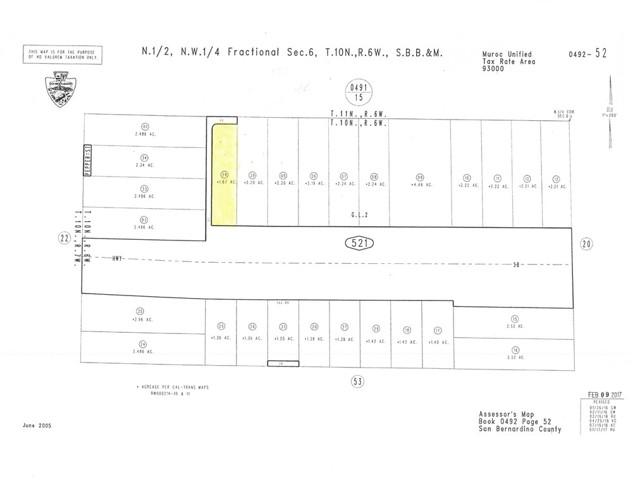 1.67 acres (134'X534') located on Salton Road at North west of the intersection of 395 Highway and 58 Highway in Kramer Junction close to all the stores on 395 and Old Highway 58. Located along the north side of Highway 58. Easy commute into neighboring cities including Boron, Barstow and Adelanto. Close to Edwards Air Force Base. Property next door (APN: 0492-521-30) can also be purchased together with the subject property. Seller may consider just selling 1 lot only. There is not an address associated with these parcels. Located in the Kramer Junction area which is Unincorporated San Bernardino County. Please use the following GPS coordinates to locate the property: 34.997921 -117.559272