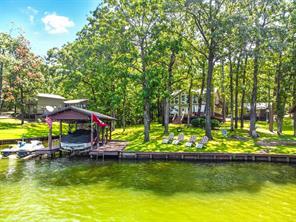 Fantastic home in Twin Coves Subdivision on Lake Cypress Springs. Perfectly positioned on a beautiful lot at the cusp of a quiet cove, the property offers stunning main lake views and a serene waterfront setting. Step inside to find a bright, open floor plan with floor-to-ceiling windows that frame the gorgeous lake views. The spacious living area features a charming rustic rock fireplace and French doors that lead out to an oversized patio, ideal for relaxing or entertaining. The kitchen is beautifully updated with granite countertops, stainless steel appliances, and a large island that offers ample space for cooking and gathering. The primary suite is conveniently located on the main level and includes an en-suite bathroom with modern finishes. A second oversized guest room with its own full bath is also located on the main floor. Upstairs, you'll find a secondary living area, two additional bedrooms, and a full bath—perfect for guests or family. The outdoor space is a true highlight, with a detached garage, generous patio areas, and a one-stall boathouse just steps from the home. An additional interior lot is included. This property is being sold mostly furnished, making it an exceptional opportunity to step into lake living with ease. A rare and fantastic deal on a beautiful waterfront lot!