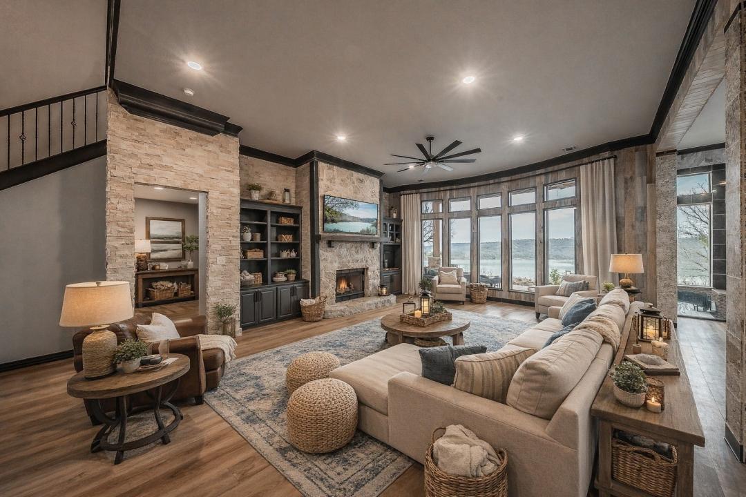 Stunning lakefront retreat nestled on 1.56 acres in a private gated community on the shores of Lake Bridgeport. This exceptional home offers breathtaking panoramic lake views and an impressive 5,000 SQFT open floor plan with 4 spacious bedrooms and 4 full bathrooms designed for both luxury living and entertaining. Step inside to soaring ceilings, luxury vinyl plank flooring, and high-end upgrades throughout. The thoughtfully designed layout includes a private office, formal dining room, expansive game room, and dedicated media room. The chef’s kitchen is truly the heart of the home, featuring a large quartz island with breakfast bar, beautiful two-tone cabinetry, glass-lit display cabinets, under-cabinet lighting, a large pantry, butler’s pantry, and a bright breakfast nook. The spacious living room showcases a cozy fireplace with built-in cabinetry and large windows framing the incredible lake views. Upstairs, the game room opens to a private balcony overlooking the lake, creating the perfect space to relax and enjoy the scenery. Guest bedrooms are generously sized and feature walk-in closets and stunning lake views, while a Jack-and-Jill bathroom with shower-tub combo serves two of the bedrooms. An additional upstairs ensuite bedroom includes its own bathroom, walk-in closet, mud bench, and balcony access. The media room is fully equipped with surround sound, screen, and projector, perfect for movie nights. Step outside to your private outdoor oasis, complete with a covered patio, outdoor kitchen, and beautiful stone fireplace, all overlooking the tranquil lake and wooded backdrop. A beautiful stone wall marks the beginning of a 10-foot wide concrete path that leads directly down to the water, making lake access easy and scenic.This rare lakefront property offers the perfect blend of privacy, luxury, and breathtaking natural beauty.