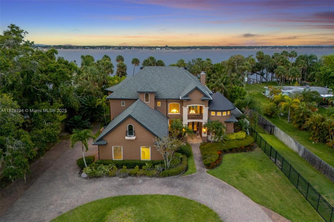 Tucked away on 2.86 acres with 118 feet of deep Intracoastal frontage, this private Merritt Island estate blends scale, seclusion, and waterfront living. A gated drive lined with century-old oaks leads to a grand residence with over 5,500 SF of living space, including solid wood floors, a chef’s kitchen with 10-ft granite island, and large windows opening to a heated pool, spa, and outdoor kitchen. Enjoy flexible living with a guest suite, office, lounge, and music room. Impact windows, 22KW generator, zoned HVAC, and an air-conditioned 3-car garage offer comfort and peace of mind.