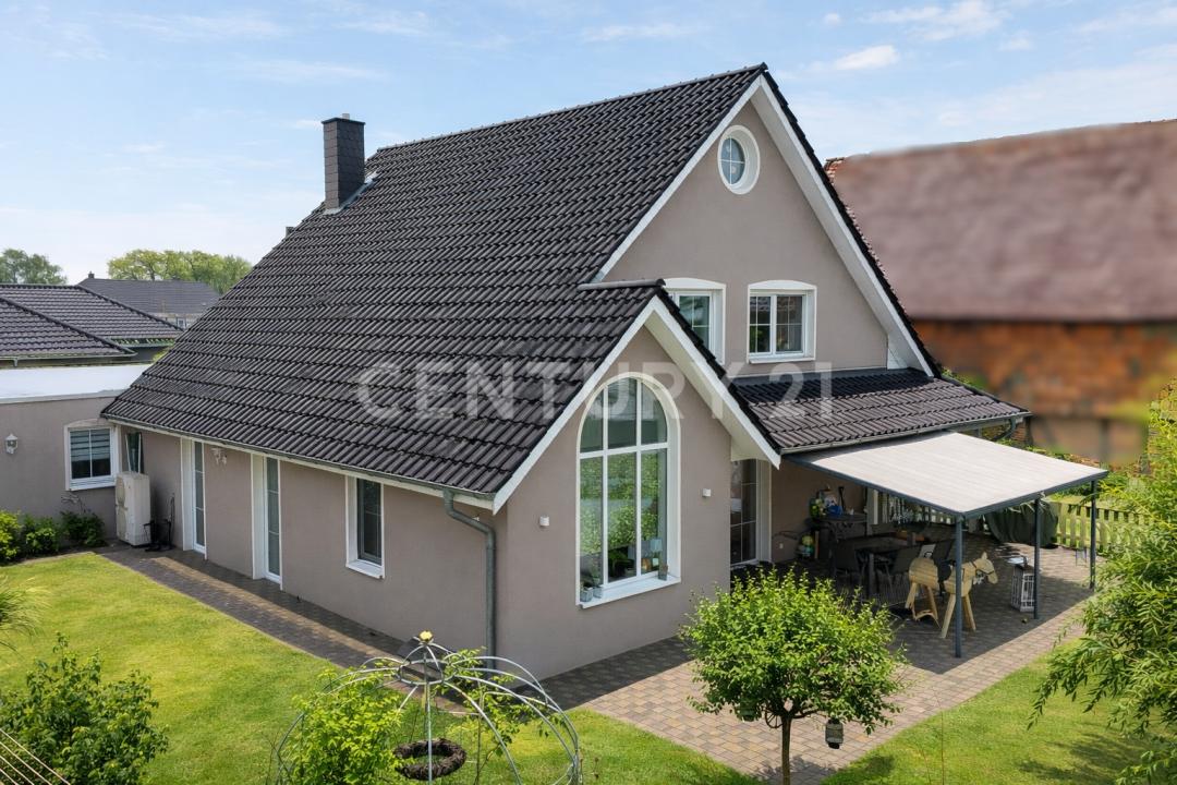 Gepflegte Grünflächen und eine einladende Terrasse bieten auch im Außenbereich hohen Wohnkomfort. Zusätzlicher Stauraum im Dachboden ergänzt das großzügige Platzangebot.