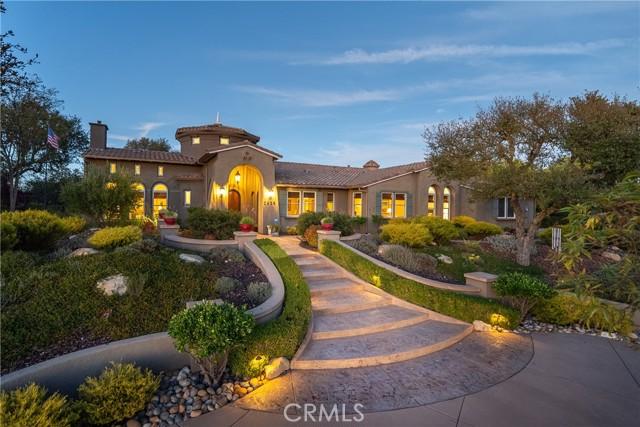 Experience refined Central Coast living in this stunning 4,146± sq. ft. Spanish Colonial estate, perfectly positioned on a private 3± acre parcel within the exclusive gates of Santa Ysabel Ranch. Enjoy sweeping 180° views of vineyards and mountains from nearly every room. This 4-bedroom, 3.5-bath home welcomes you through a grand rotunda entry with soaring ceilings, custom lighting, and travertine flooring throughout. The formal living and dining rooms feature tall Anderson windows framing breathtaking vistas and a cozy gas fireplace. The gourmet kitchen is equipped with GE Monogram stainless appliances, including a six-burner range, double ovens, wine fridge, and granite countertops with maple cabinetry. The adjoining family room and casual dining area create an inviting space for entertaining with seamless indoor-outdoor flow. The spacious primary suite offers privacy, dual walk-in closets, and a luxurious bath with soaking tub and large shower. Additional bedrooms and a flexible office space capture beautiful hillside and sunset views. Outdoor living shines with expansive flagstone patios, multiple sitting areas, and lush landscaping surrounded by heritage oaks - perfect for dining, relaxing, or entertaining under the stars. Additional features include an epoxy-finished 3-car garage with custom cabinetry, Culligan water system, ADT security, and custom lighting throughout. Santa Ysabel Ranch offers 24/7 gated security, walking trails, tennis courts, and a serene lake setting - an unparalleled blend of luxury, privacy, and natural beauty.