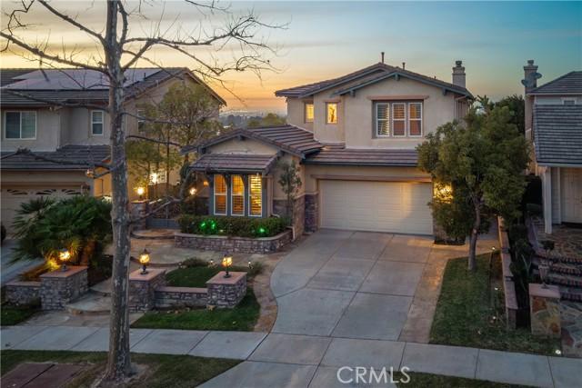 Located in the guard-gated community of Hawks Pointe, this executive-style home offers mountain views, city light views, and a flexible floor plan with a highly desirable main-floor bedroom and full bathroom. Designed with curb appeal in mind, the property features a stacked-stone and wrought-iron entry gate, flagstone walkways, and a private courtyard entry. Interior highlights include wood flooring, crown molding, custom window shutters, and an open-concept layout ideal for everyday living and entertaining. The formal dining room features designer lighting and custom wall finishes. The living room is currently configured as a home office, providing a dedicated work-from-home option. The kitchen is anchored by a large granite island with ample counter space and opens directly to the family room. French doors lead to a low-maintenance backyard with unobstructed mountain views, nearby walking trails, and city lights. Upstairs includes a spacious loft/den and generously sized secondary bedrooms with custom textured carpeting. The primary suite offers a spa-style bathroom with granite countertops, full tile shower surround, soaking tub with granite slab surround, and detailed backsplash finishes. Additional features include ceiling fans, custom blinds and drapery, curated light fixtures, and whole-house PEX plumbing, plantation shutters, LED lighting, and an abundance of storage. The main-level bedroom provides flexibility for guests or extended living needs. Hawks Pointe offers a guard-gated entrance, several mini parks, a tot lot, and scenic walking and hiking trails throughout the community. Convenient access to shopping, dining, commuter routes, with easy access to 91,5 and 57 freeway, and outdoor recreation enhances the location. This is an established community that attends good schools.