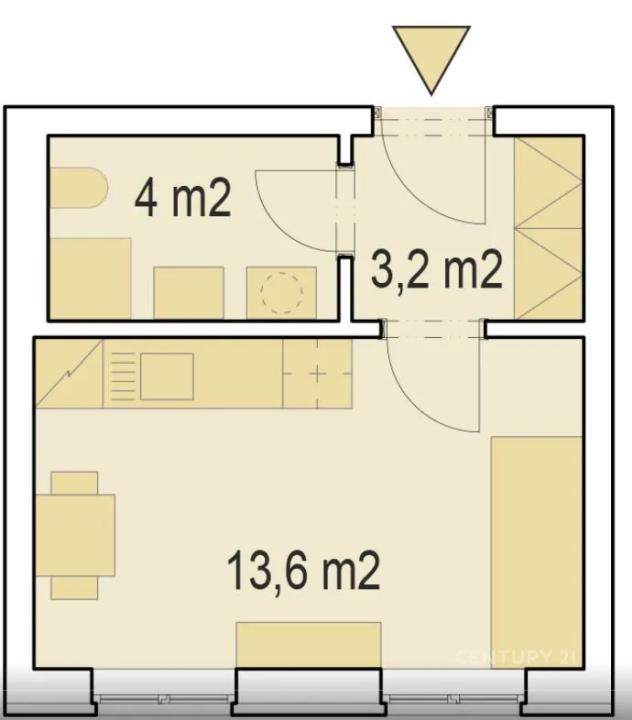 Byt je situován v 1NP. Obývací pokoj s kuchyňským koutem o velikosti 15 m2, k tomu chodba s vestavnou skříní a koupelna se sprchovým koutem, WC, otopným žebříkem, umyvadlem a vývodem na pračku.