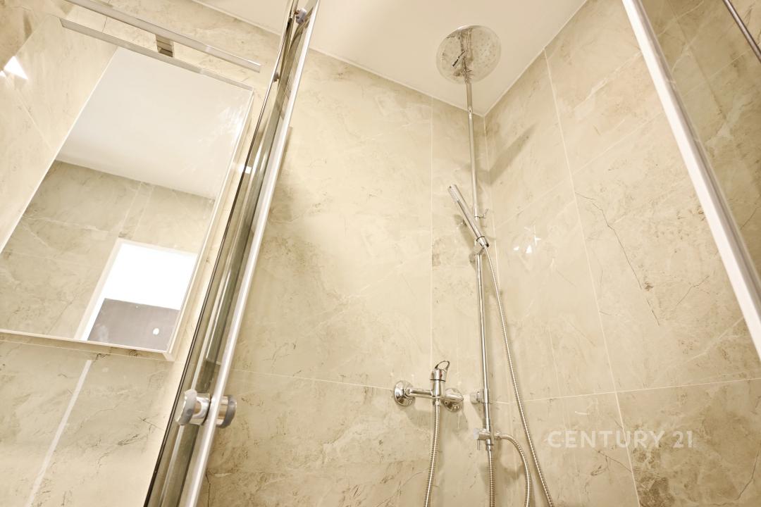 t•tStylová koupelna se sprchovým koutem, velkoformátovými obklady se vzorem mramoru, novým sanitárním vybavením, skříňkou pod umyvadlem a WC