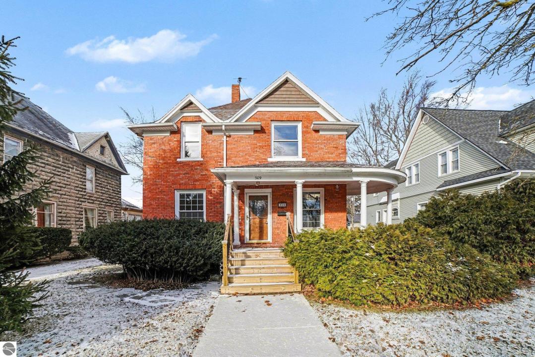 As you head up a short ½ block from Alma College Campus on Grant Ave, you'll find a 2 story, charming brick home located at 309 Grant Ave. As you walk up the newer front sidewalk and step up on the covered wrap around porch you begin feeling the rich history and charm of the home. Walking in the beautiful front door, you'll step into the foyer, with the original wood staircase greeting you with a big smile. Off from that is a flex space that has a fireplace, this could be used as a dining room, den or study, or a potential 4th bedroom. The large living area also gives flexibility to an eating/dining area and a back room off from that is just begging to have a heat source installed so it could be part of the livable layout as the room is finished outside of that. Updates in the kitchen and baths, some windows and furnace/AC are comforting pluses. Upstairs are plenty of original wood floors and an awesome landing area that could be used for many things. Fenced in yard, detached garage, and location, location, location are more highlights from the exterior. Speaking of location, walking distance to campus, downtown and the Fred Meijer Heartland Trail is hard to beat. Come visit 309 Grant, see it's beauty and history, you may just buy it!