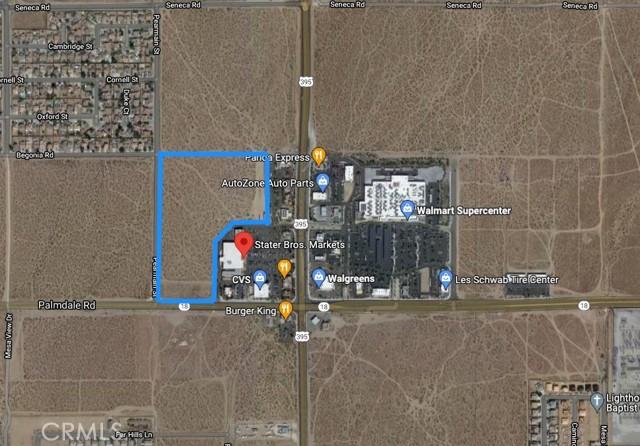 Prime commercial property at the major intersection of Hwy 395 and Palmdale Blvd in city of Adelanto! APNs 3103-521-07 and 3103-521-19 together a total of 22.52 acres. Several national franchises such as Stater Brothers, US Bank, Chase, Starbucks, Subway, Del Taco, Denny's Carl's JR, KFC, Autozone, Panda Express, Dollar Tree, Super Walmart, Wendy's, McDonald's, Walgreens, Taco Bell, Wingstop, and El Pollo Loco are in the adjacent center. The site is zoned for commercial and may be subdivided for future development. Curb, gutters and utilities are already on site, don't miss this opportunity!