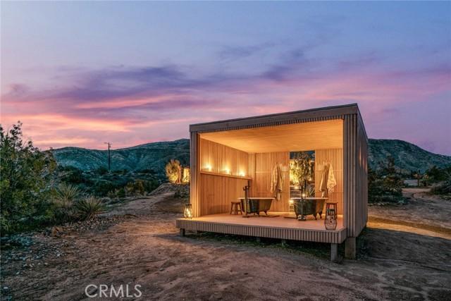 Dramatic mountain views envelop you from all directions in this artist-designed mid-century retreat spanning 5 serene acres under the majestic backdrop of Mt San Jacinto. The original 1959 brick cabin serves as an open concept living & dining area with soaring exposed beam ceilings, a cozy wood burning fireplace, built-ins, and a modern kitchen complete with quartz countertops, new copper plumbing, and a clever hidden under-counter fridge. A thoughtfully curated 2022 renovation introduces a chic new primary bedroom, oversized bathroom, bonus sleeping loft, and mini splits for climate control. The generously sized bedroom features a walk-in closet and built-in office nook, punctuated by a wall of glass sliders inviting you to take in the striking outdoor panorama. Down the hall you’ll find a hidden stackable washer & dryer and a spa-like bathroom with venetian plaster, dual sinks, a soaking tub, a shower room, and a separate water closet. A ladder opens to a secret upstairs 300 sq ft sleeping loft with more impressive views, making a delightful guest bunk or a quirky clubhouse for the kids. A 384 sq ft covered outdoor patio spans the rear of the home, leading to an open-air lounge and dining area with a gas grill, propane fire pit, and built-in hammocks to unwind under the stars. Follow the professionally landscaped path down to the most instagrammable moment of them all - a bespoke wooden bathhouse where 2 vintage clawfoot tubs beckon you to enjoy a hot soak framed by yet another incredible view. Ideally situated less than 2 hours to LA, 15 minutes to Palm Springs, 20 minutes to Joshua Tree National Park, and surrounded by 154,000 acres of publicly accessible canyons, preserves, white waters, trails, and mountain peaks of the Sand to Snow National Monument, this property is the perfect home-base for everything from romantic getaways to family adventures. Sold turnkey so you can grab your suitcase and move right in, or take over the “guest favorite” airbnb account to start generating short term rental income right away. An original 1968 Silver Streak trailer and adjacent buildable 5 acre parcel are available to purchase separately to create your own 10-acre multi-parcel dream compound.