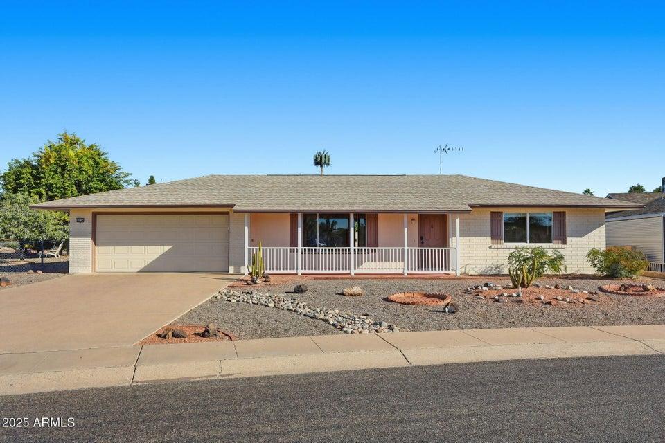 Ideally located Sun City 55+ home offering comfort and convenience! This 2-bedroom, 1-bath gem features a 2-car garage on an oversized lot near shopping, dining, groceries, and medical services. Fresh exterior paint and refreshed desert landscaping (12/25) create instant curb appeal. Inside, enjoy a bright open floor plan with a spacious great room, kitchen with dining area, and updates including a walk-in shower (2024), new A/C (2022), newer roof, and garage door opener. Enjoy beautiful Arizona sunsets from your back patio, complete with a convenient storage shed. Sun City offers golf, pools, fitness centers, clubs, and a wide variety of activities—this home truly has it all.