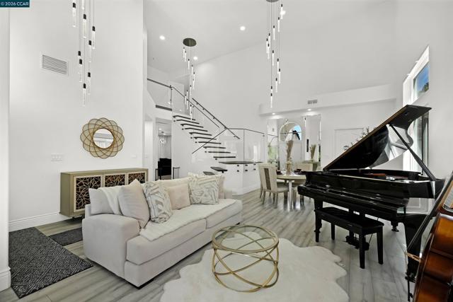 Welcome to a home that makes an unforgettable first impression. Showcasing striking curb appeal, soaring ceilings, and a beautifully remodeled interior, this residence blends modern elegance with everyday comfort. Natural light pours into the impressive main living area, highlighted by a stunning fireplace, statement glass staircase, and upscale finishes throughout. The updated kitchen offers a clean, timeless design with sleek cabinetry, generous prep space, and seamless flow for both daily living and entertaining. Upstairs, the spacious primary suite feels like a true retreat, while the remodeled bathrooms and versatile bonus/media room add comfort and flexibility. Step outside to a thoughtfully redesigned backyard where towering trees create a striking natural backdrop and an added sense of privacy. Enhanced with a beautifully updated retaining wall, expansive concrete hardscape, and a spa, the outdoor space is both polished and functional — ideal for entertaining, unwinding, and enjoying the setting year-round. Stylish, inviting, and thoughtfully upgraded, this is the kind of home that truly stands apart.