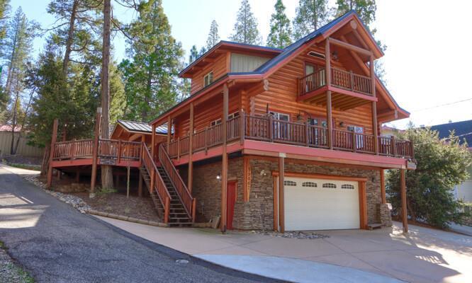 Designed with both style and functionality in mind, the home features a spacious and inviting layout. The main level includes two comfortable bedrooms, ideal for family or guests, while the private master suite provides a true retreat with a stunning rock shower that brings a spa-like experience right into your home. The large kitchen serves as the heart of the home, offering ample space for cooking, gathering, and entertaining. A beautifully remodeled laundry room adds convenience and modern appeal. Outdoor living is where this property truly shines. Enjoy a variety of spaces including a covered porch, open porch, and expansive decksall perfectly positioned to take in the serene lake views and surrounding natural beauty. Additional highlights include an extra-large two-car garage, generous parking options, and dedicated space for boat storagemaking it easy to embrace the full Bass Lake lifestyle. Whether you're looking for a full-time residence or a mountain getaway, this one-of-a-kind home delivers comfort, character, and unforgettable views