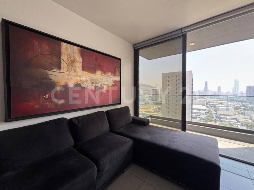 Departamento en venta con vista al Cerro de la Silla de 101.68 m2 en el piso 11, equipado y amueblado en la Torre Bakara, Colonia Santa María, Monterrey NL con seguridad 24/7. Incluye mantenimiento, 2 cajones de estacionamiento en nivel 4, frente a elevador.