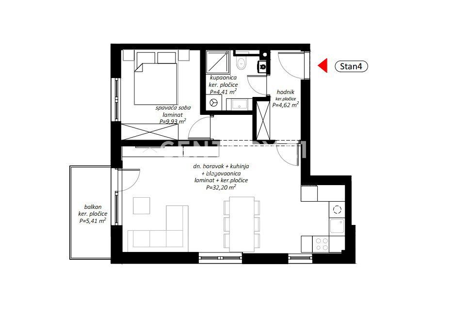 - spacious open space living area (kitchen, dining room, and living room) with a total area of 32 m2 with access to the balcony