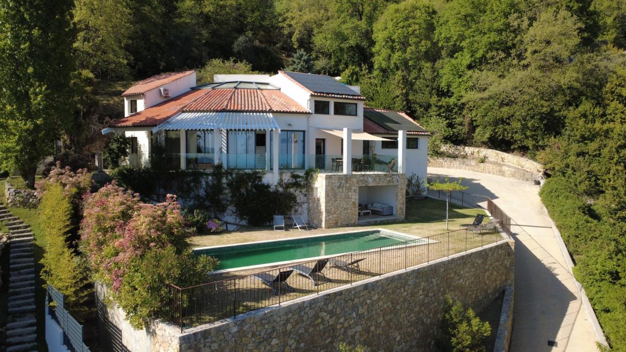 Nestled atop a hill overlooking Magagnosc, this fully renovated house offers breathtaking sea views. The living room opens onto large bay windows that bring the landscape indoors, whilst the kitchen and adjoining utility room ensure practical everyday living. Four spacious bedrooms, each with its own en-suite bathroom, offer privacy and comfort; a large study has been converted into a home cinema. The pool house, swimming pool and garden surrounding the property create an ideal outdoor space to enjoy the climate, and the separate garage perfectly complements this living environment.