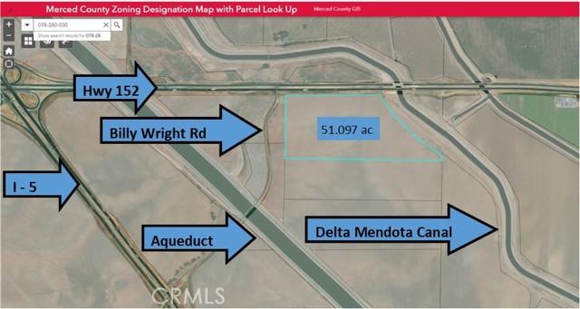 Conveniently located on the west side of Los Banos, close to I-5. It's zoned A-1 (20 acre minimum); however, look at the Merced County GIS image. It appears the west corner is zoned commercial; you'll need to check with the County for allowable uses. Power pole on site, well, and San Luis Water District rights. What might you do with this? May be sold with APNS 078-280-031 and/or 032.