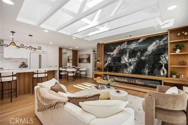 Experience unparalleled luxury in this impeccably remodeled, move-in-ready home that seamlessly blends sophistication with modern comfort. From the moment you step inside, you're greeted by an abundance of natural light and breathtaking media/fireplace wall that creates an inviting and serene ambiance. The sunny patio serves as a versatile space, perfect for relaxation or entertaining guests. The home's transformation includes a comprehensive renovation featuring central HVAC and a series of bespoke architectural enhancements. Notably, the living room boasts a stunning skylight and a custom wood and tile media surround, complemented by tailored lighting solutions. The residence exudes warmth and elegance throughout. The gourmet kitchen is a chef's dream, equipped with custom cabinetry, quartz countertops, and top-of-the-line appliances and fixtures. A generous waterfall-style island provides ample counter space and serves as a central hub for social gatherings. Retreat to the luxurious master suite, thoughtfully designed en-suite bathroom features a spacious, custom-tiled shower and premium appointments, offering a spa-like experience. Additional highlights include abundant built-in storage solutions and a conveniently located stackable washer and dryer in the hall closet. Parking is easily accessible, adding to the home's convenience. Residents of Laguna Woods Village enjoy access to an array of exceptional amenities, including golf, swimming, tennis, and a vibrant selection of clubs and social activities, all within a premier 55+ community. For a comprehensive view of this remarkable home, please click on the 360 Virtual Tours (VT) link.